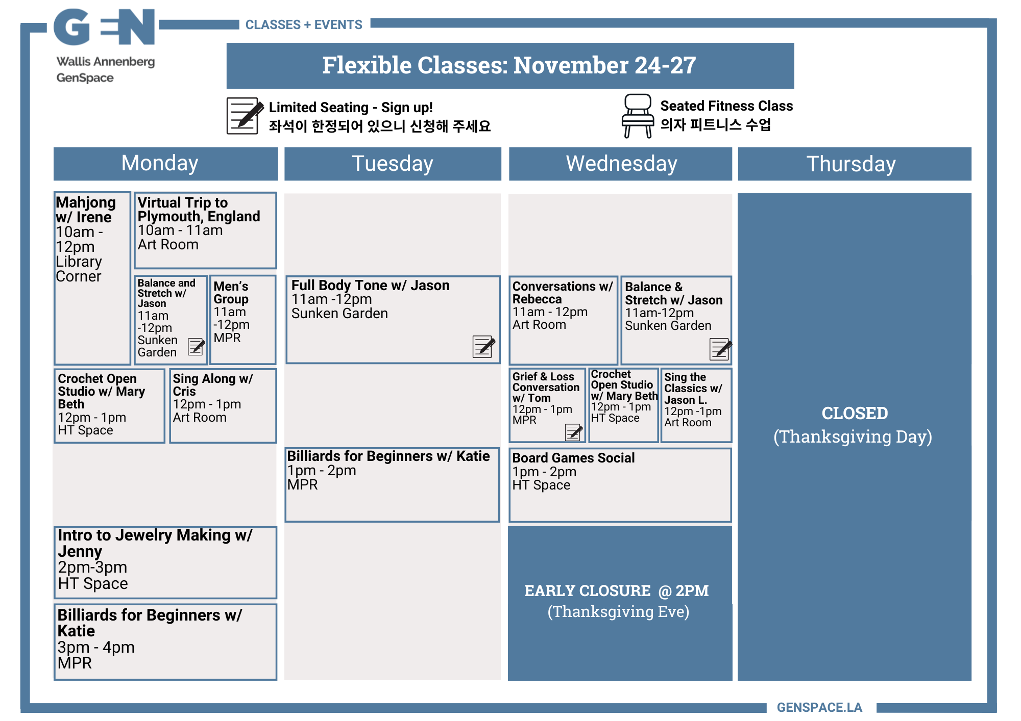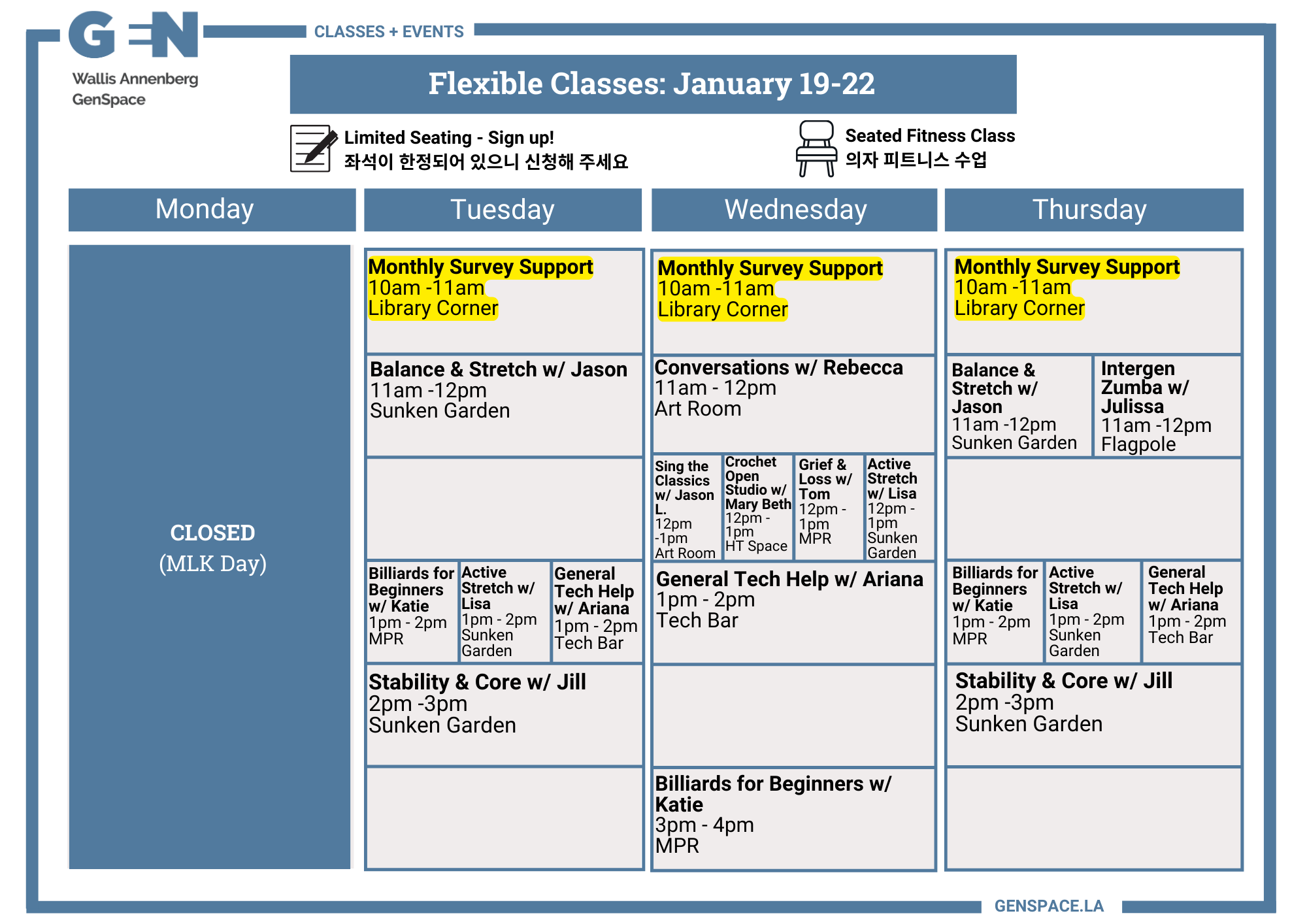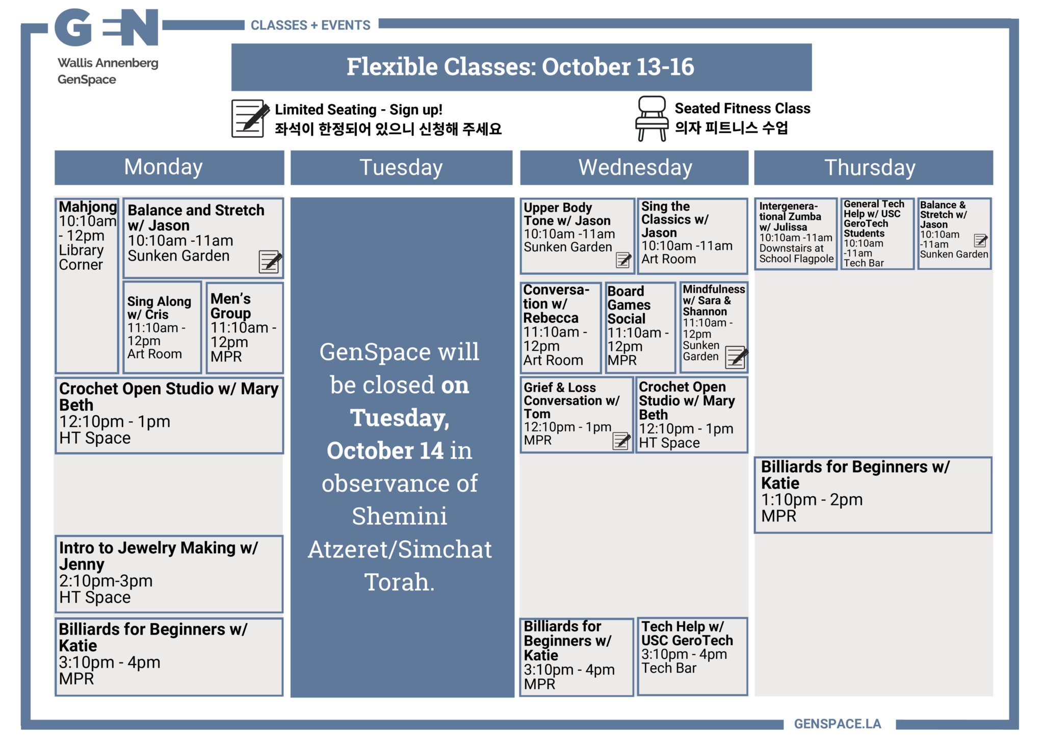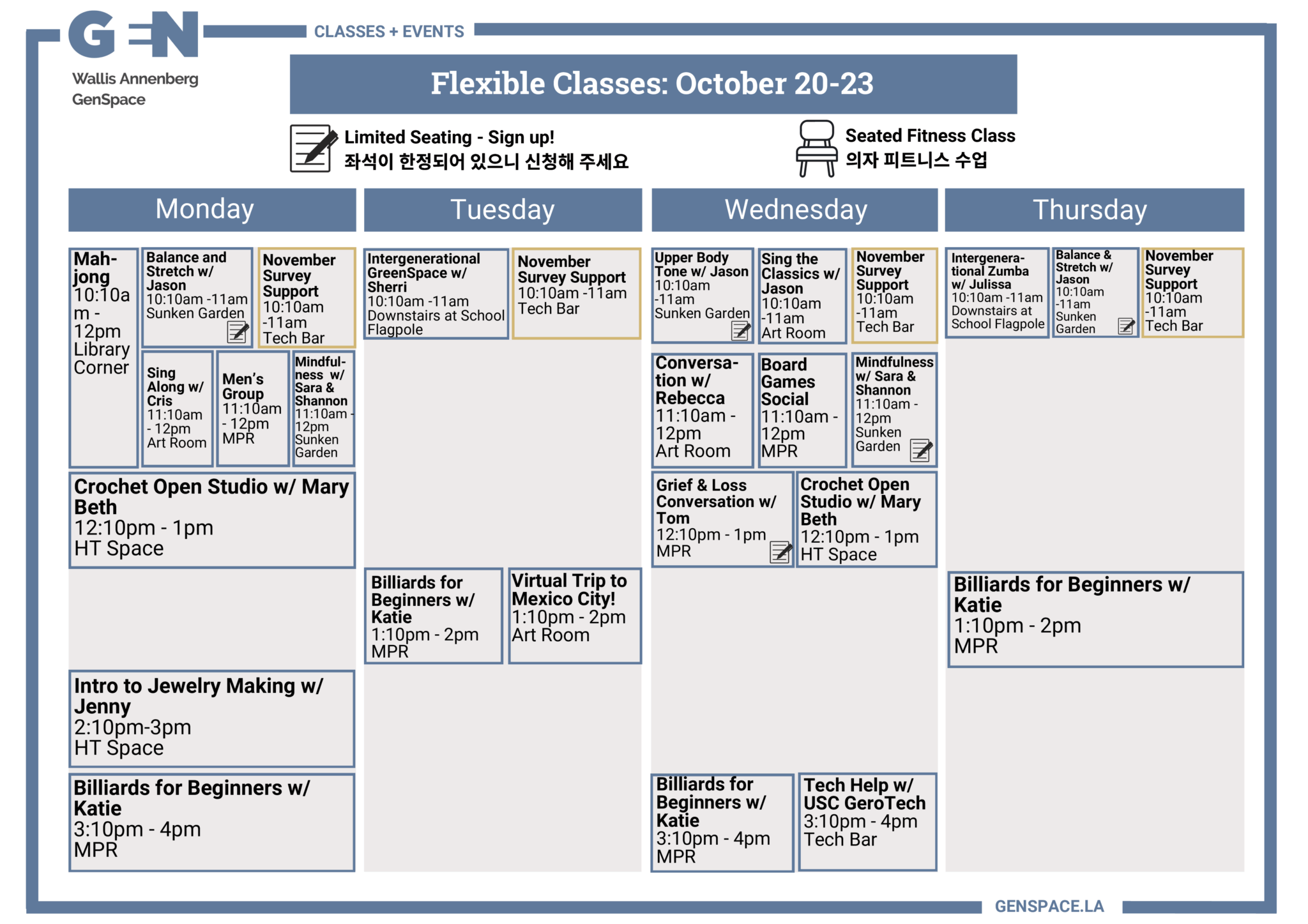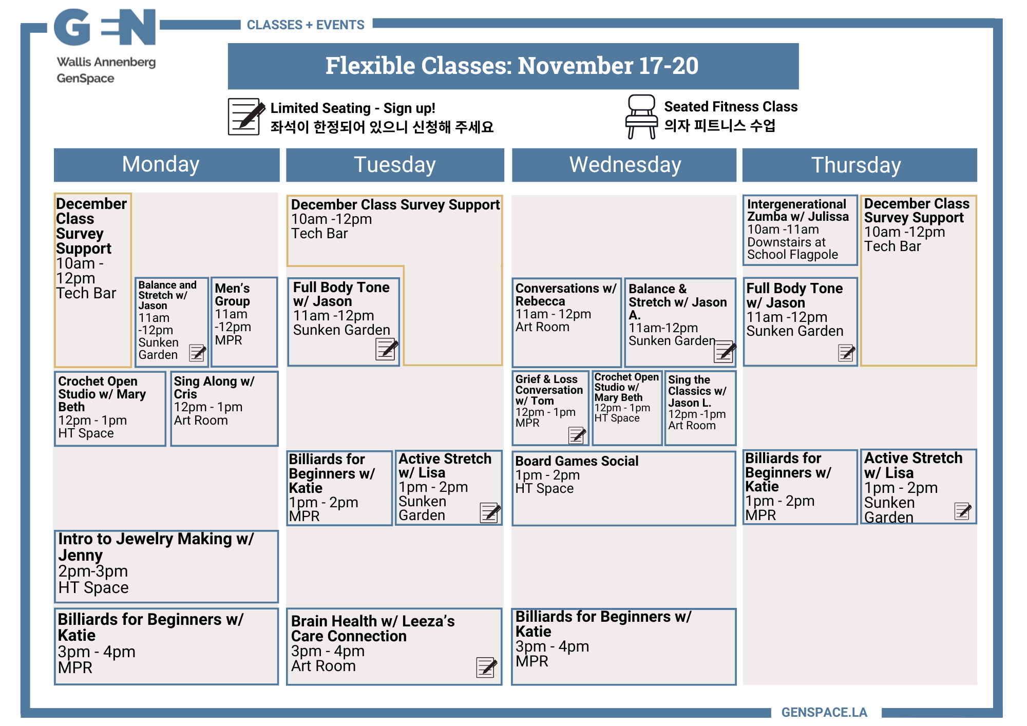 Connect now with others, discover new interests, and explore ways to live happily and healthily with exciting new classes, special events, and other activities at GenSpace.